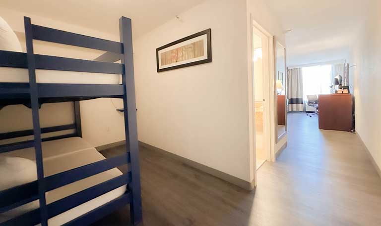With two queens and a bunk bed, this spacious room is perfect for families and includes free WiFi access, TV, a microwave and mini fridge, iron and ironing board, hair dryer, coffeemaker with complimentary coffee, in-room safety deposit box, flat screen television and phone with voicemail. The bunk bed area is perfect for children. This area has its own television.